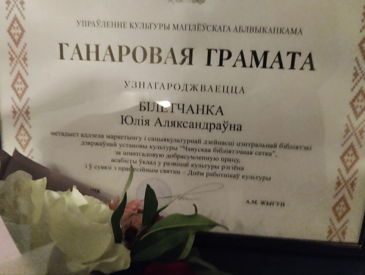 маркетинга, социокультурной деятельности и методической работы Билетченко Ю.А. была награждена Почетной грамотой управления культуры Могилевского облисполкома.