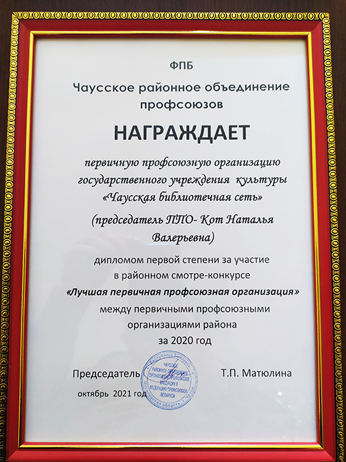 На отчетном профсоюзном собрании первичной профсоюзной организации ГУК "Чаусская библиотечная сеть" присутствовала председатель районного объединения профсоюзов Матюлина Тамара Петровна и председатель профкома работников культуры Подолякина Надежда Леонидовна, которые вручили коллективу ГУК "Чаусская библиотечная сеть" диплом 1 степени за участие в районном конкурсе "Лучшая первичная профсоюзная организация".
