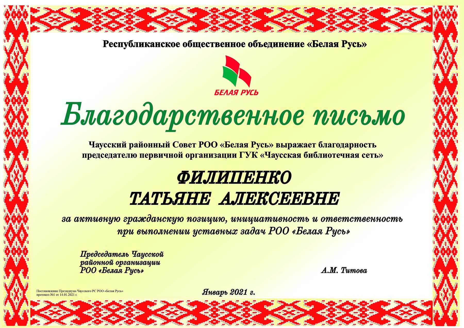 Заведующий детской библиотекой Филипенко Татьяна Алексеевна была награждена Благодарственным письмом РОО "Белая Русь" за активную жизненную позицию, инициативность и ответственность за выполнение уставных задач РОО "Белая Русь".