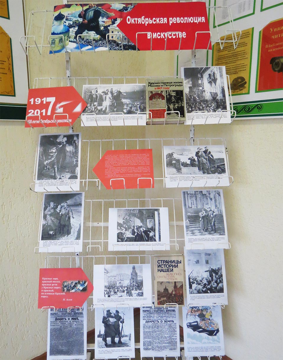 В преддверии 100-летия октябрьской революции, в фойе центральной библиотеки оформлена тематическая выставка «Октябрьская революция в искусстве». На ней представлены книги, иллюстрации картин знаменитых художников, отражающие исторические события того времени. Данная выставка дает возможность каждому читателю почувствовать атмосферу тех революционных дней и составить свое мнение об этой знаковой дате в истории.