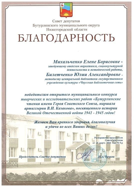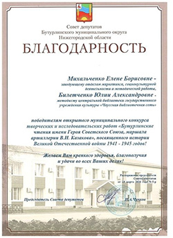По итогам «XIX-x Бутурлинских чтений имени Героя Советского Союза, маршала артиллерии В.И. Казакова» сотрудники отдела маркетинга, социокультурной деятельности и методической работы центральной библиотеки награждены Благодарностью Совета депутатов Бутурлинского муниципального округа Нижегородской области