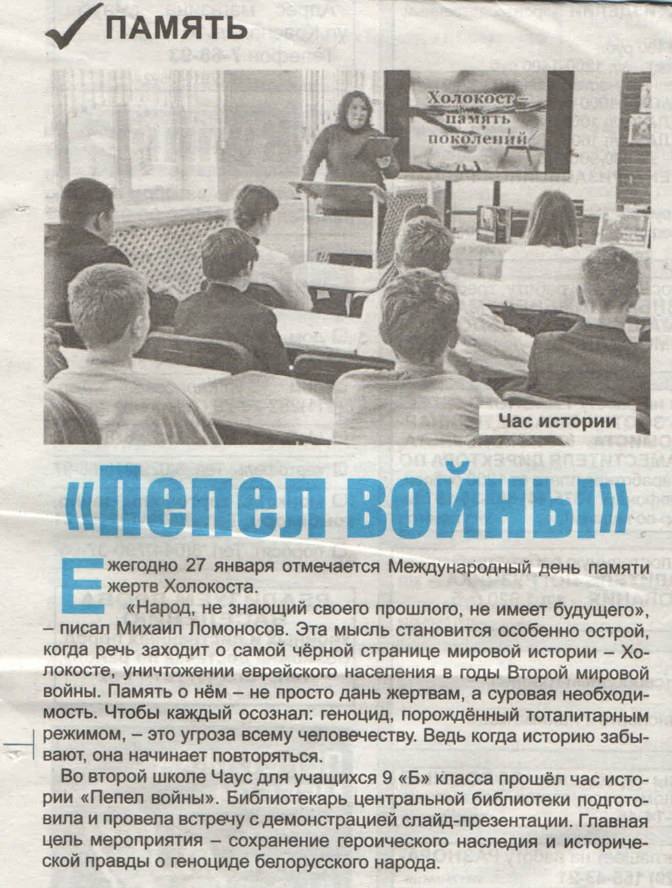 В Чаусском районном доме культуры 15 сентября с размахом отметили 105-летие центральной библиотеки [Электронный ресурс] / .- Искра : газета . — Режим доступа : https: //www.chausynews.by / 90709. — Дата доступа :15.09. 23. смотреть>> 2022 1.Минина В. ИСТОРИЧЕСКИЙ ЧАС «ХОЛОКОСТ – ПАМЯТЬ ПОКОЛЕНИЙ» ПРОШЕЛ В ЧАУСАХ [Электронный ресурс ] / Валентина Минина // Искра : газета .— Режим доступа : https: // www.chausynews.by /64934/ .— Дата доступа : 27.01.2022. смотреть>> 2. Исторический час «Холокост – память поколений» прошел в чаусской СШ №1 [Электронный ресурс ] // MogilevNEWS.by : сетевое издание. — Режим доступа : https: // mogilevnews.by/news/27-01-2022-11-44/78759 .— Дата доступа : 27.01.2022. смотреть>> 3.ТЕЛЕМОСТ МЕЖДУ БЕЛОРУССКИМИ ЧАУСАМИ И РОССИЙСКИМ ЗЕЛЕНОГРАДСКОМ [Электронный ресурс ] // IСКРА : газета — Режим доступа : https://www.chausynews.by/?p=671862022. — Дата доступа : 31.03.2022. смотреть>> 4.Объединил «Долг» [Электронный ресурс] // ВОЛНА : газета . — Режим доступа : https://volnanews.ru/society/culture/obedinil-dolg2022 . — Дата доступа : 08.04.2022. СМОТРЕТЬ>> 4. ЧАУСЫ, ДАШКОВКУ, ЗЕЛЕНОГРАДСК СВЯЗАЛ ТЕЛЕМОСТ ПОБЕДЫ [Электронный ресурс] // ИСКРА : газета — Режим доступа : https://www.chausynews.by/?p=685342022 .— Дата доступа : 08.05.2022. смотреть>> 5. СВЯТА БЕЛАРУСКАГА ПІСЬМЕНСТВА АДЗНАЧАЮЦЬ У ЧАВУСАХ [Электронный ресурс] // ИСКРА : газета . — Режим доступа : https://www.chausynews.by/?p=747722022 . — Дата доступа : 04.09.2022. смотреть>> 6. Калинина Л. ЛИТЕРАТУРНО-МУЗЫКАЛЬНАЯ КОМПОЗИЦИЯ "ОСЕНЬ ЗОЛОТО РОНЯЕТ" ПРОШЛА В ЧАУСАХ [Электронный ресурс] // ИСКРА : газета . — Режим доступа :https://www.chausynews.by/76121/ 2022. — Дата доступа : 29.09.2022. СМОТРЕТЬ>> 2021 1 ФИЛИПЕНКО Т.А. 4 ФЕВРАЛЯ 65 ЛЕТ ТОМУ НАЗАД РАСПАХНУЛА ДВЕРИ ДЛЯ СВОИХ ЮНЫХ ЧИТАТЕЛЕЙ ЧАУССКАЯ ДЕТСКАЯ БИБЛИОТЕКА // ІСКРА .- 2021 .- 6 ЛЮТАГА .- С.3 смотреть>>